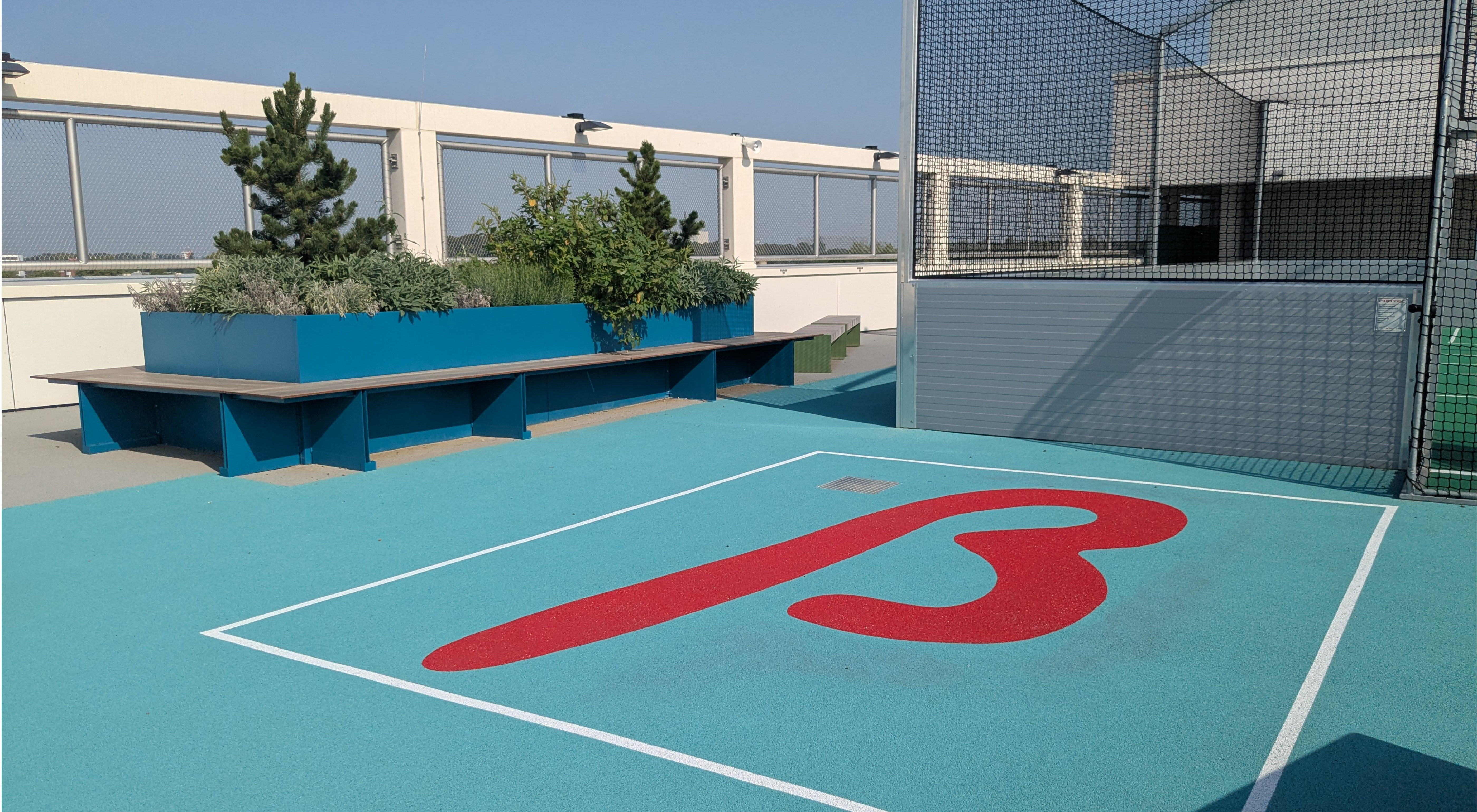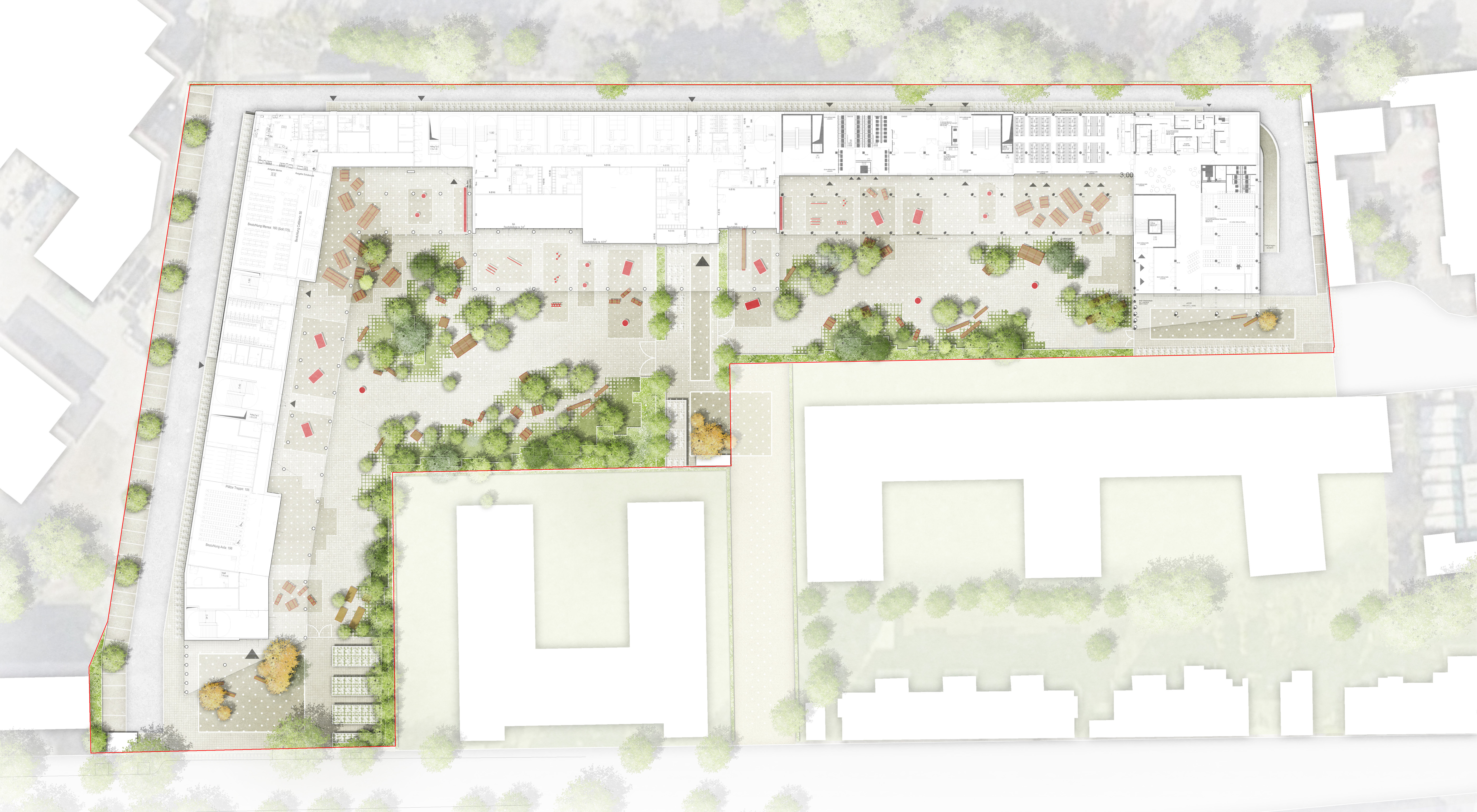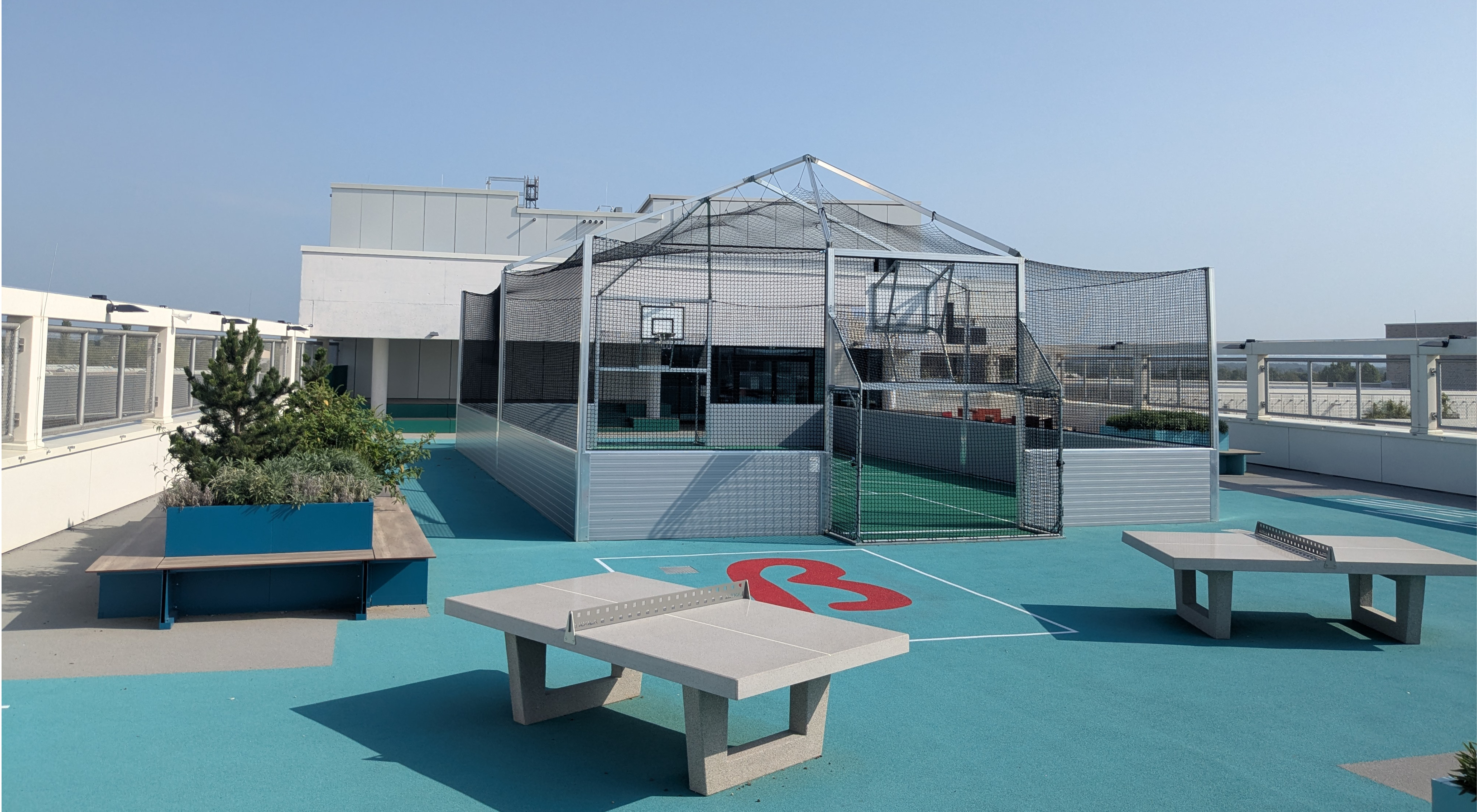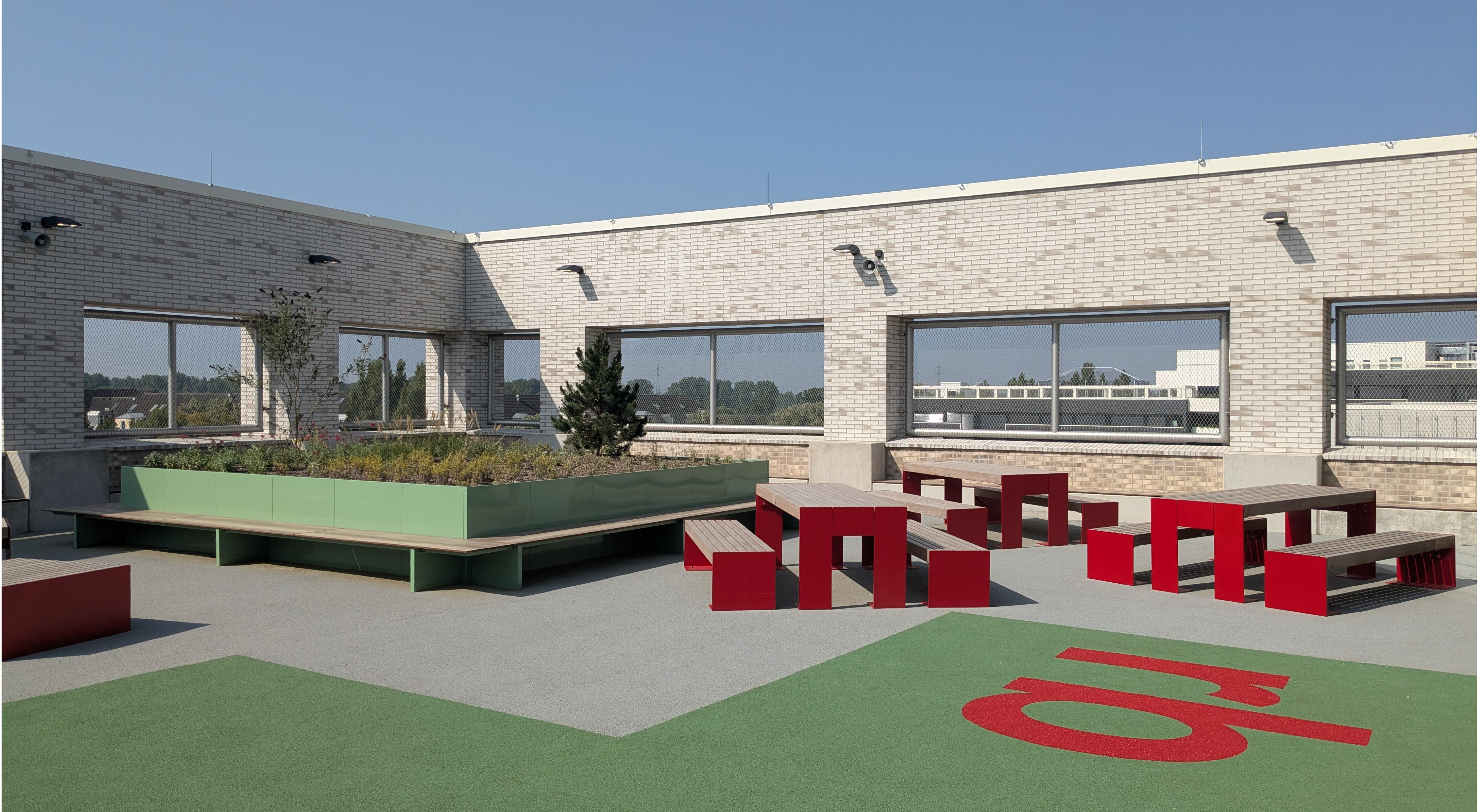 Das Freiraumkonzept gliedert die Anlage in Vorplätze, Schulhöfe und Dachschulhöfe mit Sport- und Aufenthaltsangeboten. Neben Aktiv- und Ruheinseln auf dem Gelände bieten die Dachflächen mit Cageballfeld, Tischtennis und bepflanzten Sitzbereichen attraktive Freiräume mit Ausblick.