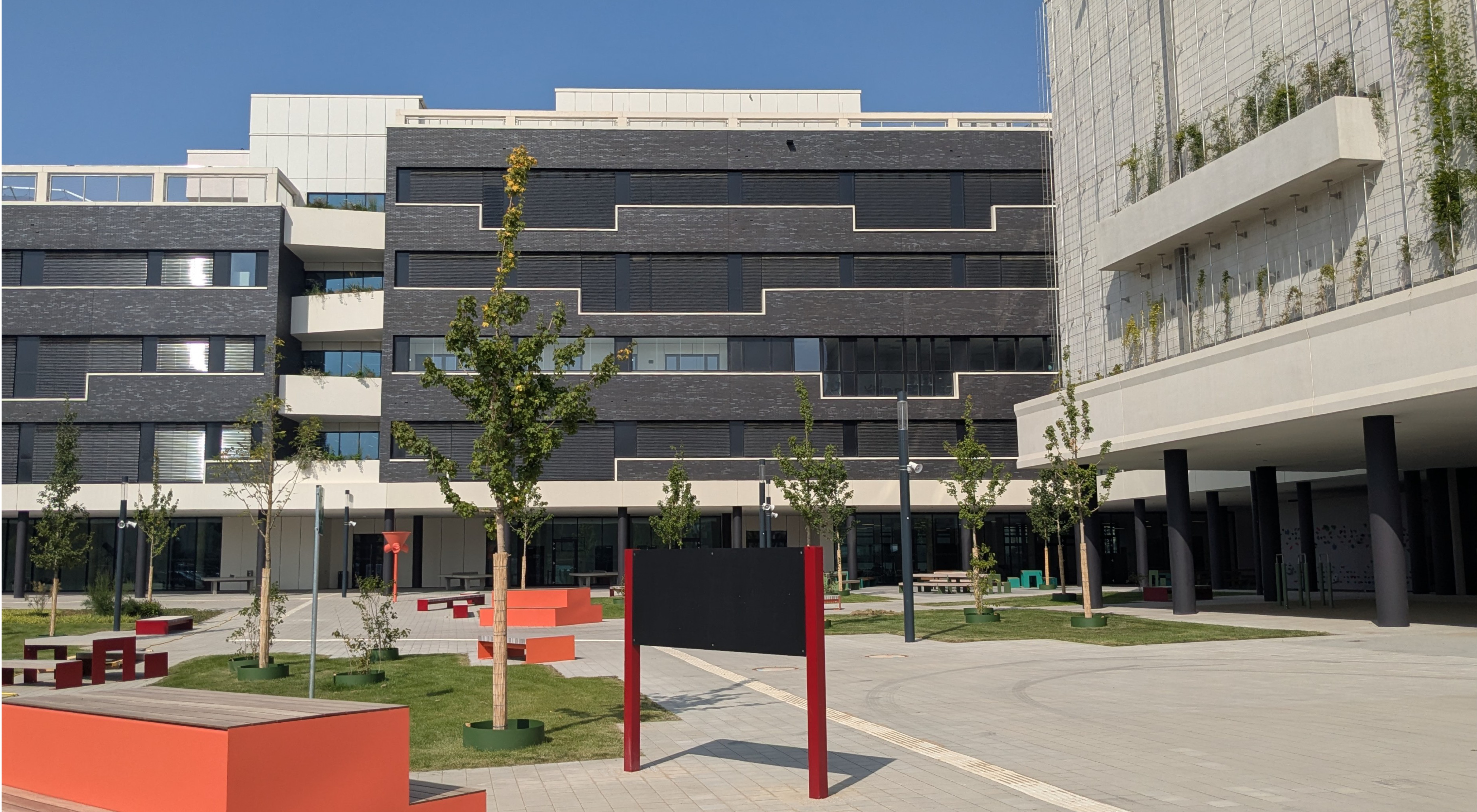 Der neue Schulcampus an der Benrodestraße vereint Realschule, Gymnasium und Sporthalle zu einem modernen Lernort, der Bewegung, Aufenthalt und Nachhaltigkeit in den Mittelpunkt stellt.
