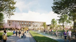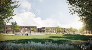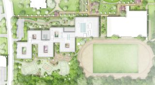 Der Neubau des Schulzentrums ersetzt den alten Gebäudekomplex an einem südlicheren Standort. Der alte Gebäudekomplex weicht einer großzügigen Parkanlage mit multifunktionaler Rasenfläche, die gestalterisch Anlehnung an die bereits vorhandenen Parkwege mit Wiesenflächen findet.