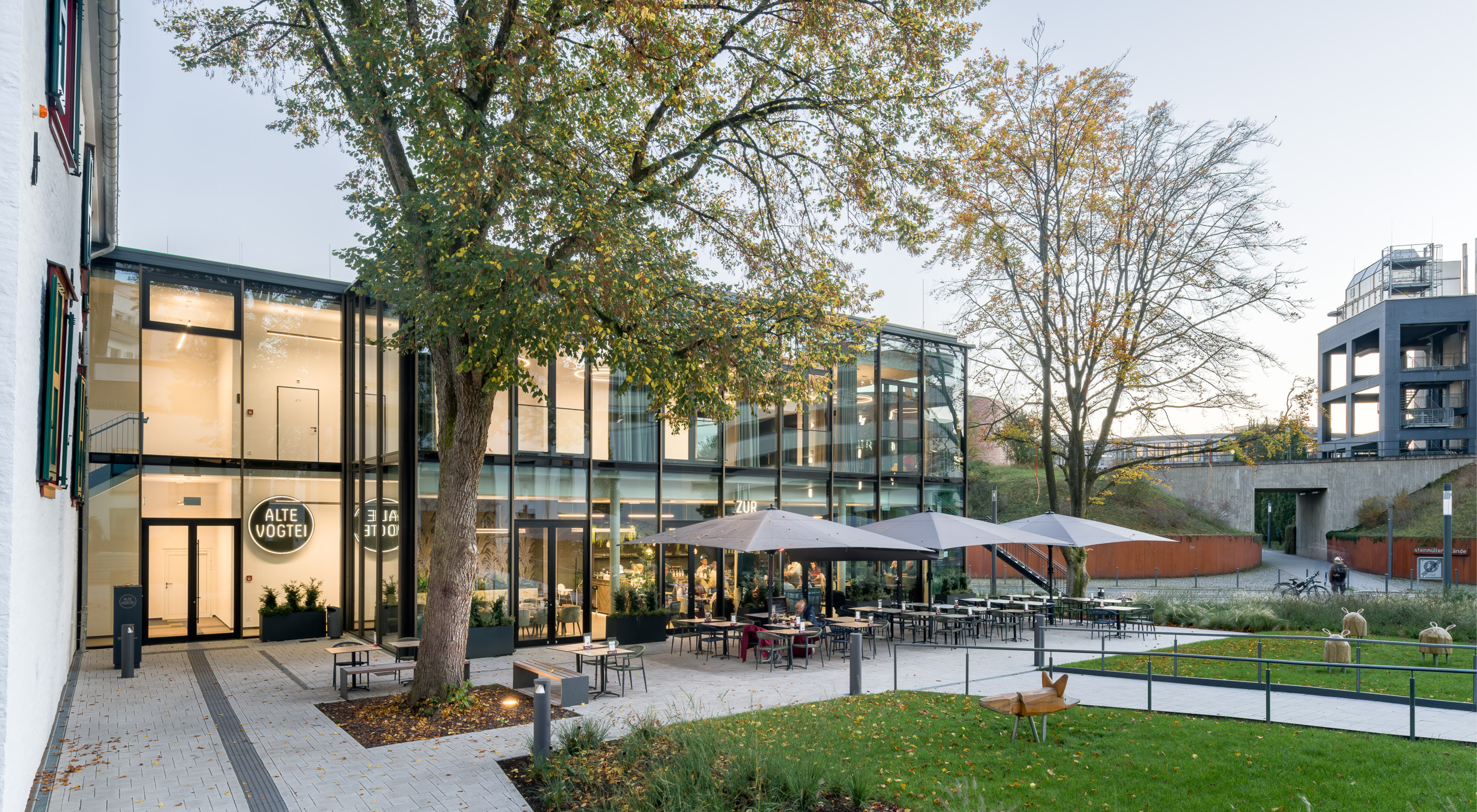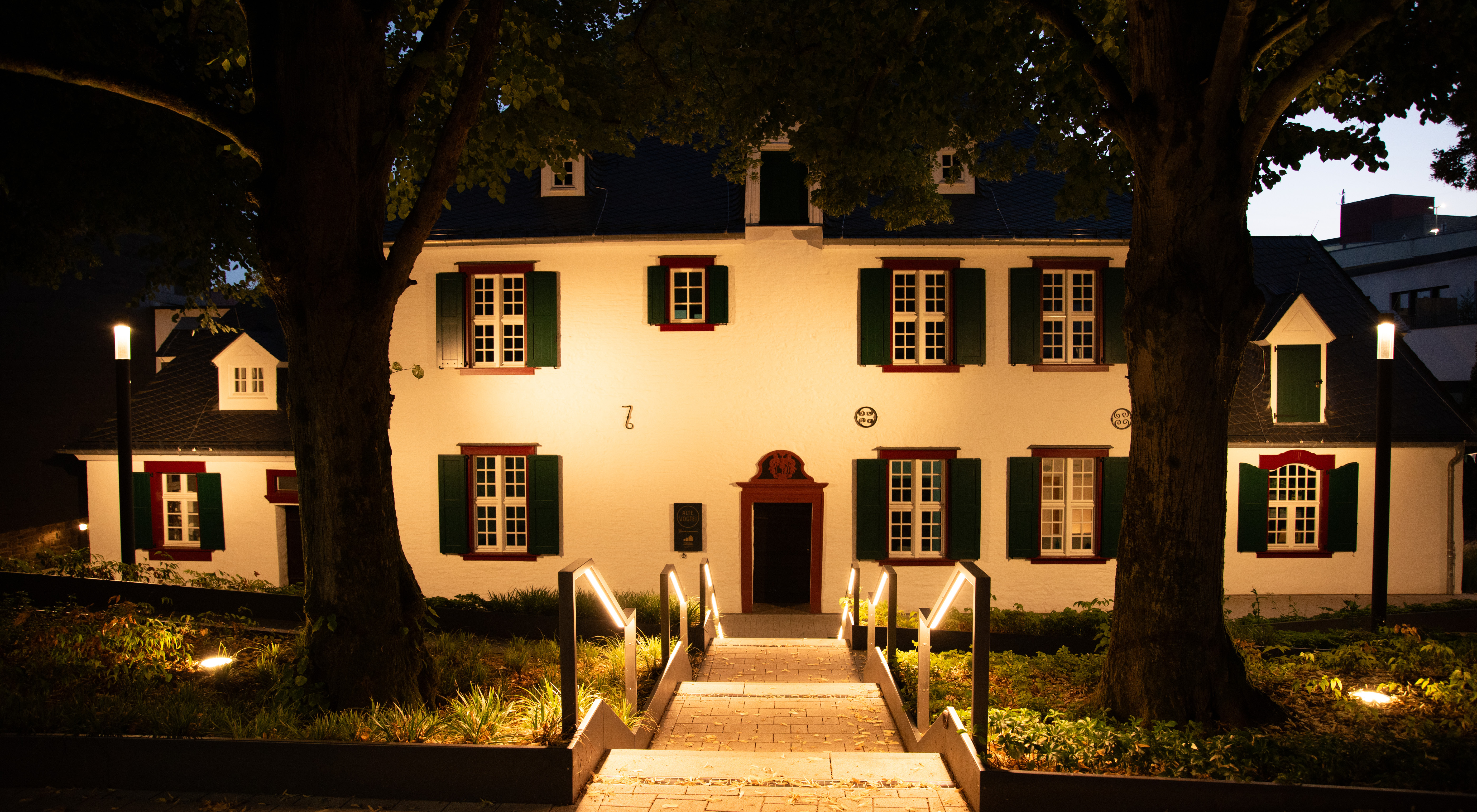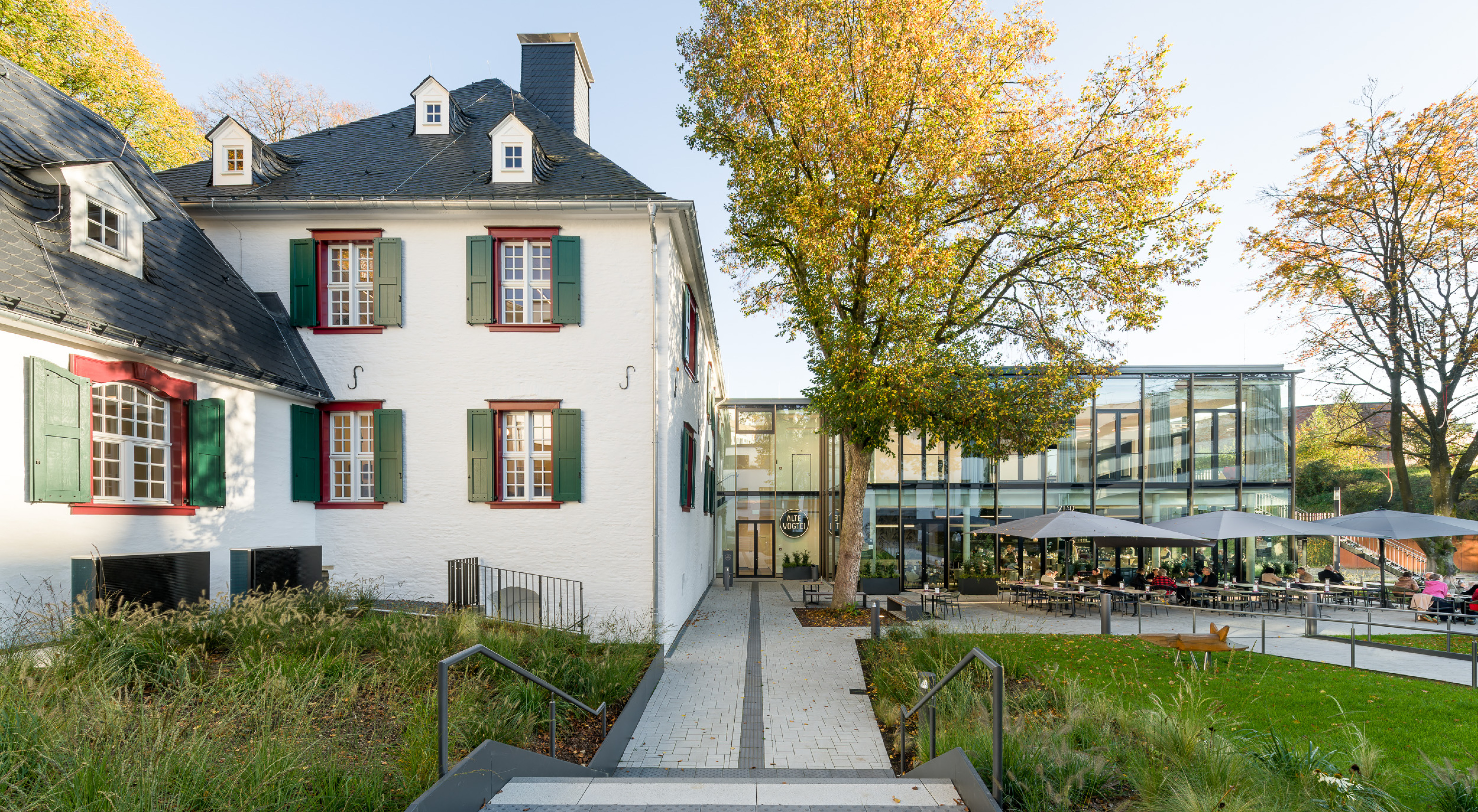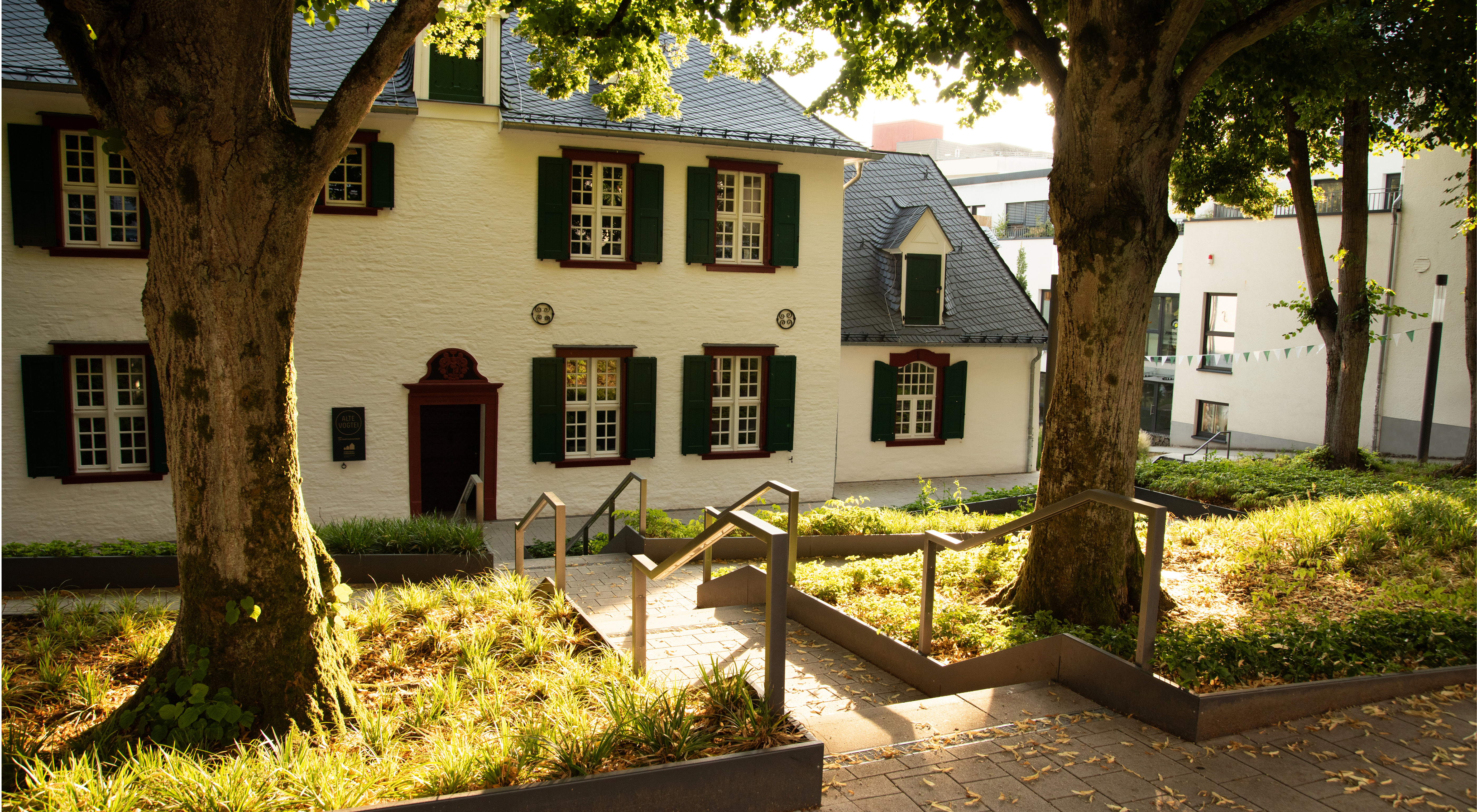 Das Gestaltungskonzept für die Freianlagen der Alten Vogtei betont die historische Bedeutung des Gebäudes und verbindet sie mit zeitgemäßer Freiraumgestaltung. Im Mittelpunkt steht ein grünes Entree, das barrierefrei den Höhenunterschied von der Kaiserstraße zum Gebäude überwindet und durch geometrischen Pflanzflächen, Stahlkanten und Beleuchtung in Szene gesetzt wird. Ein Vorplatz bietet Raum für Empfänge und Begegnungen. Rückwärtig ergänzen modellierte Stauden- und Gräserflächen einen geschützten Bereich, der auch für Außengastronomie genutzt wird. Hochwertige Materialien, klare Formen und ein zurückhaltendes Beleuchtungskonzept schaffen eine ruhige, atmosphärische Gestaltung, die das historische Gebäude hervorhebt und seine Rolle als Wahrzeichen im Stadtraum stärkt.
