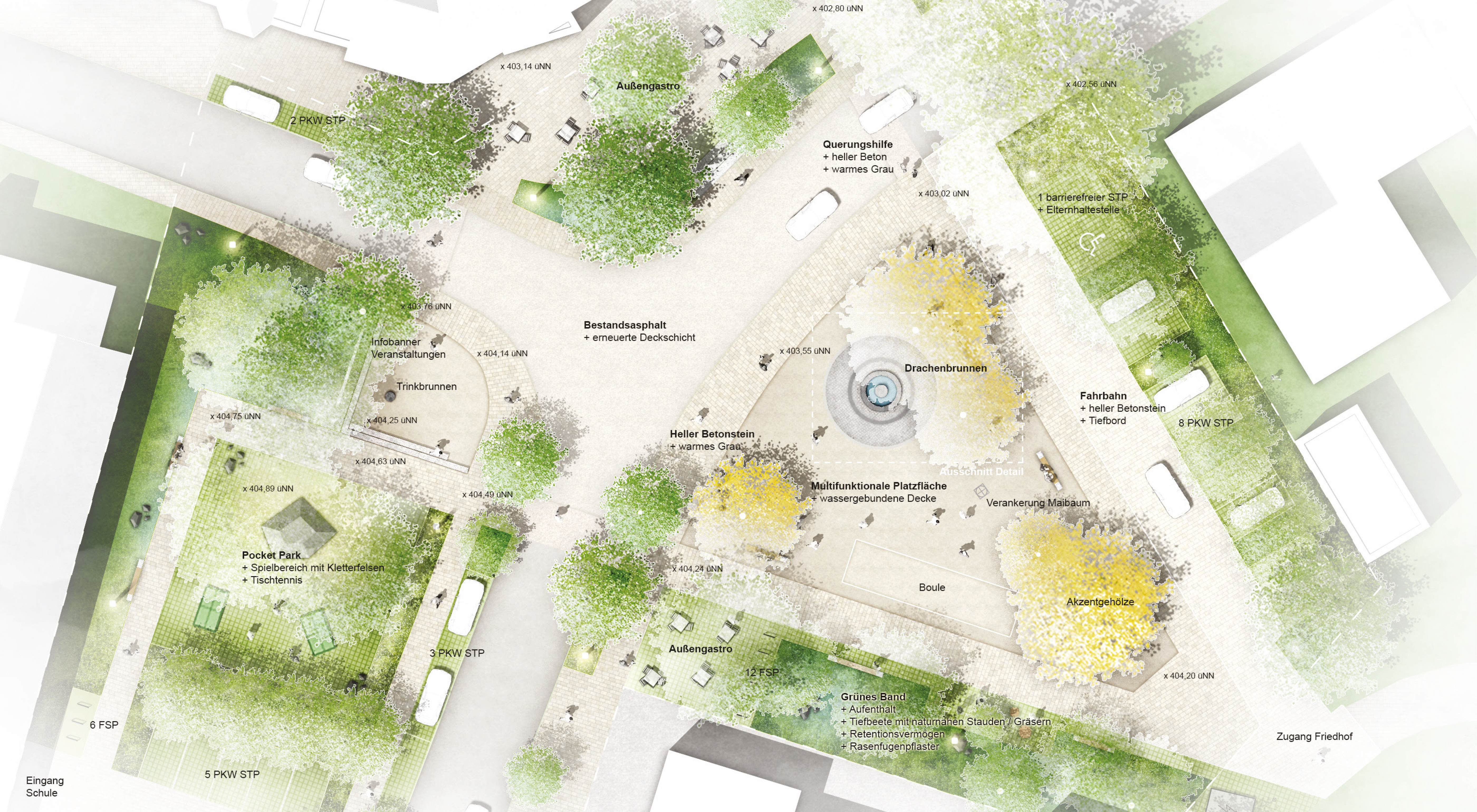 Die Gestaltung integriert regionale Materialien wie Schiefer, klimaresiliente Bepflanzung und folgt dem Schwammstadt-Prinzip: Regenwasser wird zurückgehalten, versickert oder gesammelt. Bestehende Grünräume werden vernetzt und weiterentwickelt. Durch das autoärmere Konzept, neue Radabstellplätze und klar definierte Stellflächen entsteht ein zukunftsfähiger öffentlicher Raum – offen, resilient und identitätsstiftend.