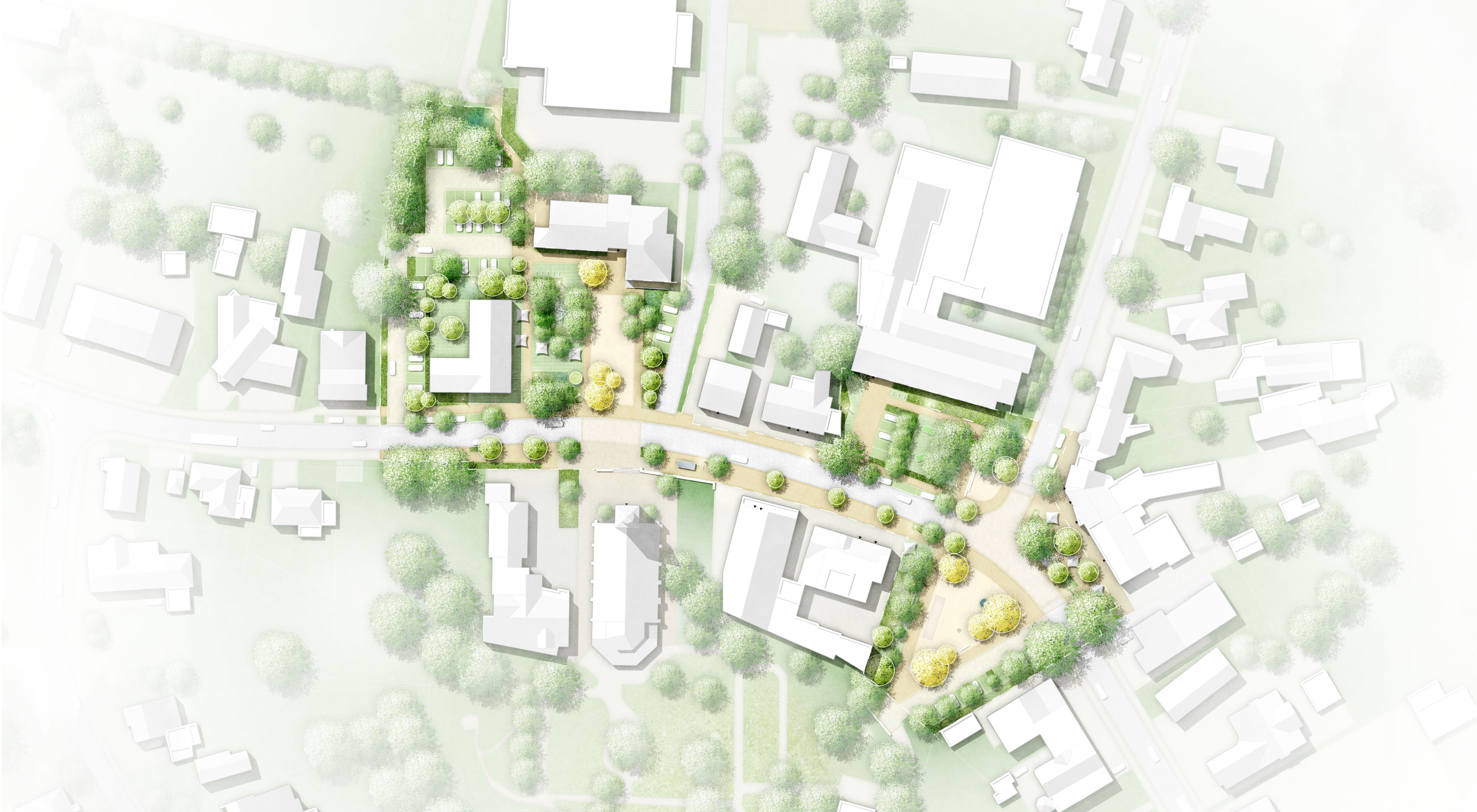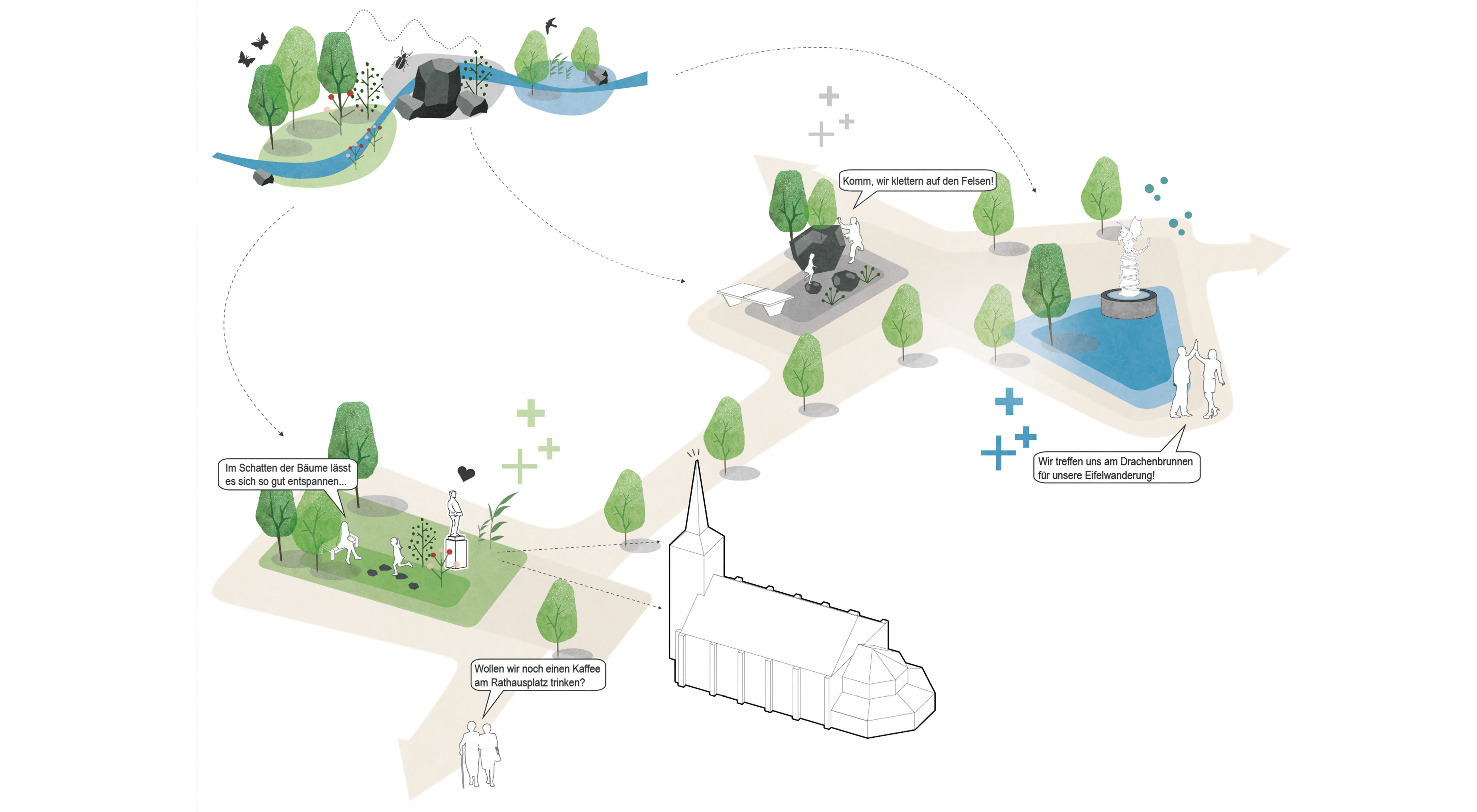Die neue Ortsmitte Roetgen verbindet städtebauliche Qualität mit landschaftlicher Identität. Drei klar gegliederte Plätze – sogenannte „Eifelfenster“ – strukturieren den Raum und schaffen Aufenthaltsqualität für alle Generationen. Flexible Platzflächen, begrünte Ränder, Wasser- und Spielelemente bieten Raum für Austausch, Erholung und Veranstaltungen.