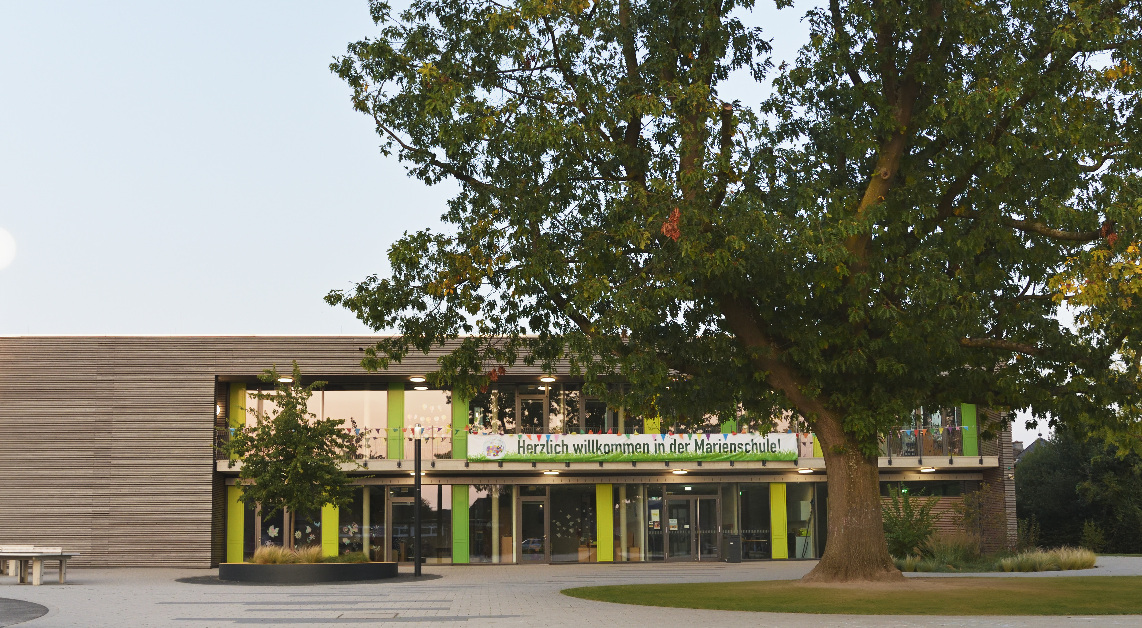 Die Bepflanzung der Außenanlagen umfasst eine Mischung aus bestehenden Gehölzen, neu gepflanzten Hainbuchenhecken und solitären Klein- und Großbäumen wie Kupfer-Felsenbirne, Fächerahorn und Ginkgo. Strauchpflanzungen und Bodendecker wie Blutjohannisbeere, Goldglöckchen und Kornelkirsche runden das grüne Konzept ab. Die Ausstattung mit Hockerbänken, Tischtennisplatten und Sitzblockstufen sowie die gezielte Anordnung von Fahrradabstellplätzen und Müllstandorten tragen zu einem funktionalen und attraktiven Schulumfeld bei.