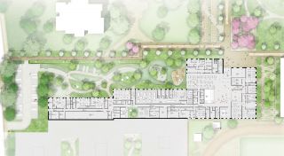 Der Neubau des Schulzentrums ersetzt den alten Gebäudekomplex an einem südlicheren Standort. Der alte Gebäudekomplex weicht einer großzügigen Parkanlage mit multifunktionaler Rasenfläche, die gestalterisch Anlehnung an die bereits vorhandenen Parkwege mit Wiesenflächen findet.