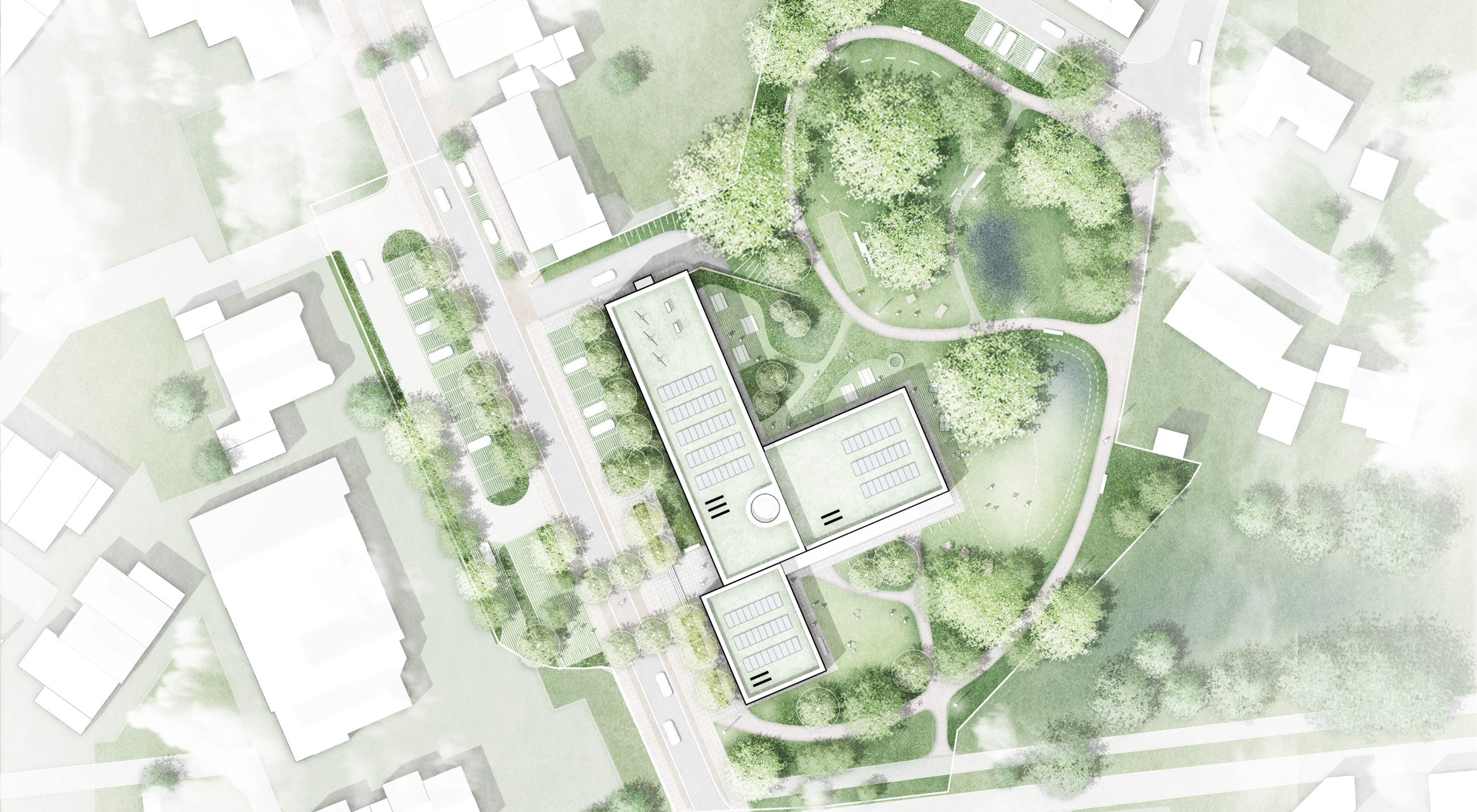 Die Freianlagen sind als integrative, ökologische und generationenübergreifende Freiräume konzipiert, die das Bürgerzentrum als offenen Ort der Begegnung stärken. Ein repräsentativer Vorplatz schafft ein klares Entree, während der angrenzende Bürgerpark vielfältige Angebote für Aufenthalt, Spiel, Bewegung und Veranstaltungen bietet.