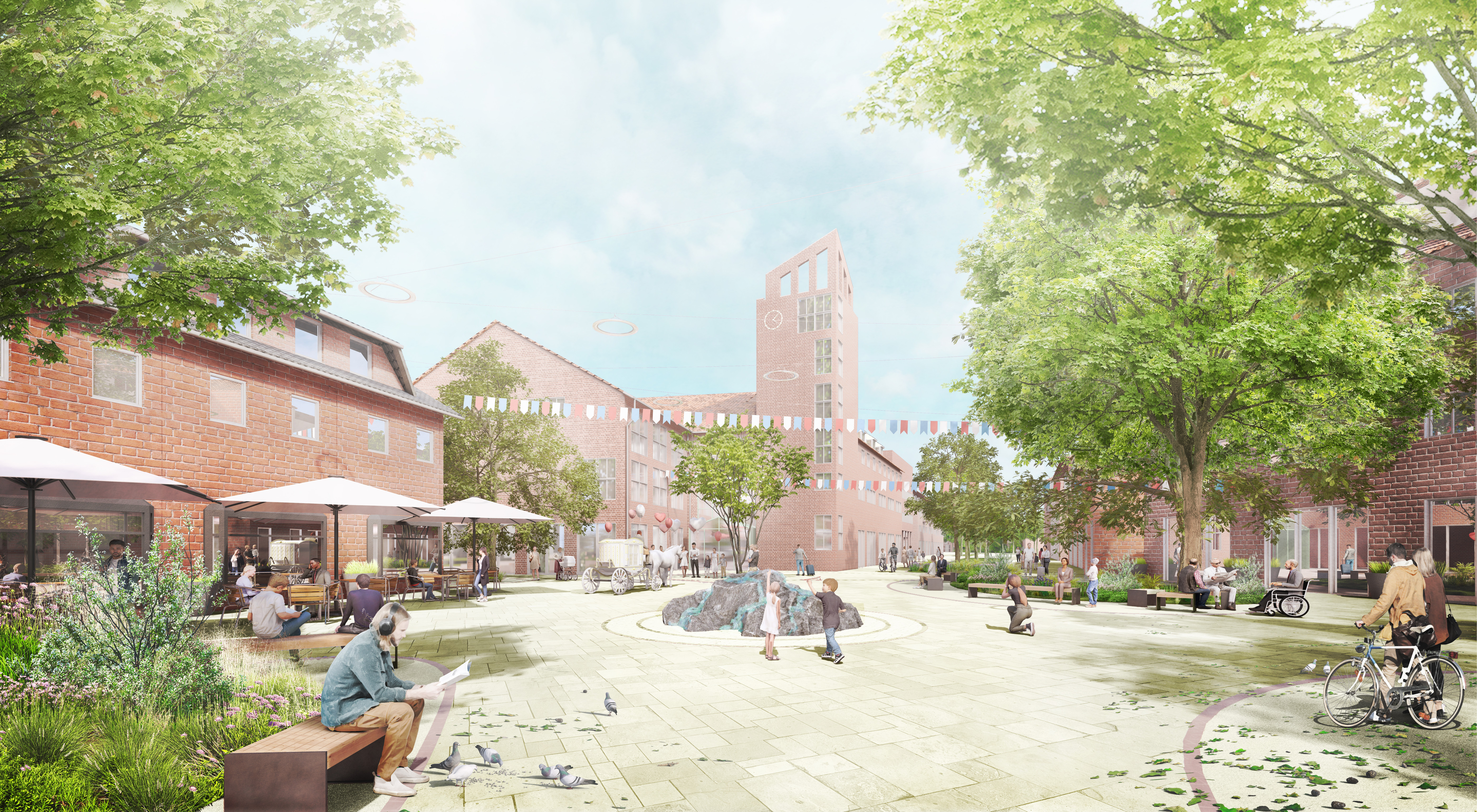 Die Gestaltung setzt auf robuste Natursteinbeläge, wiederverwendete Materialien, barrierefreie Wegeführungen und großzügige Schattenräume. Shared-Space-Elemente fördern aktive Mobilität, während multifunktionale Platzbereiche für Veranstaltungen und Alltagssituationen gleichermaßen nutzbar sind. Der Entwurf vereint ökologische Wirksamkeit, soziale Qualitäten und nachhaltige Wirtschaftlichkeit zu einem zukunftsfähigen Innenstadtquartier.