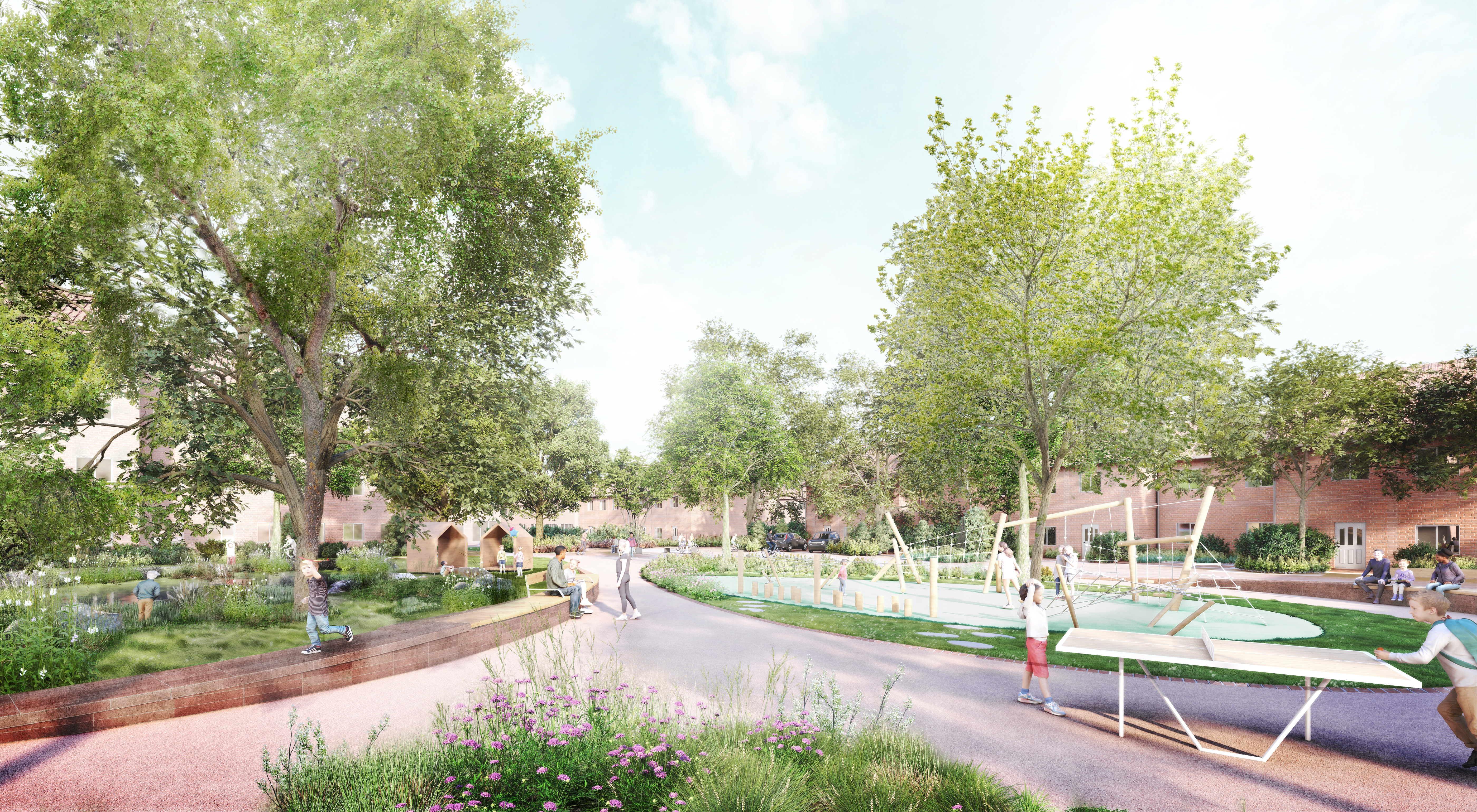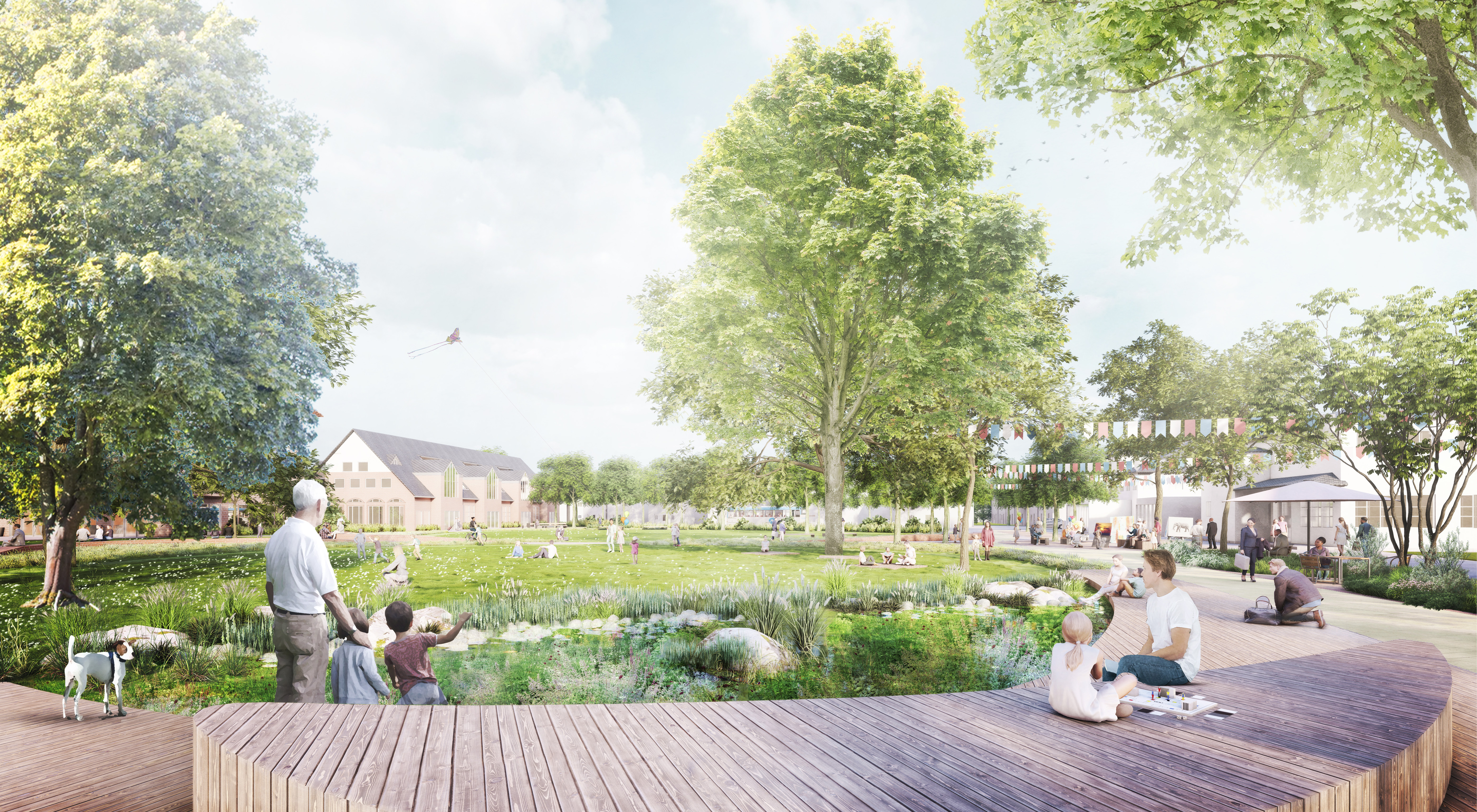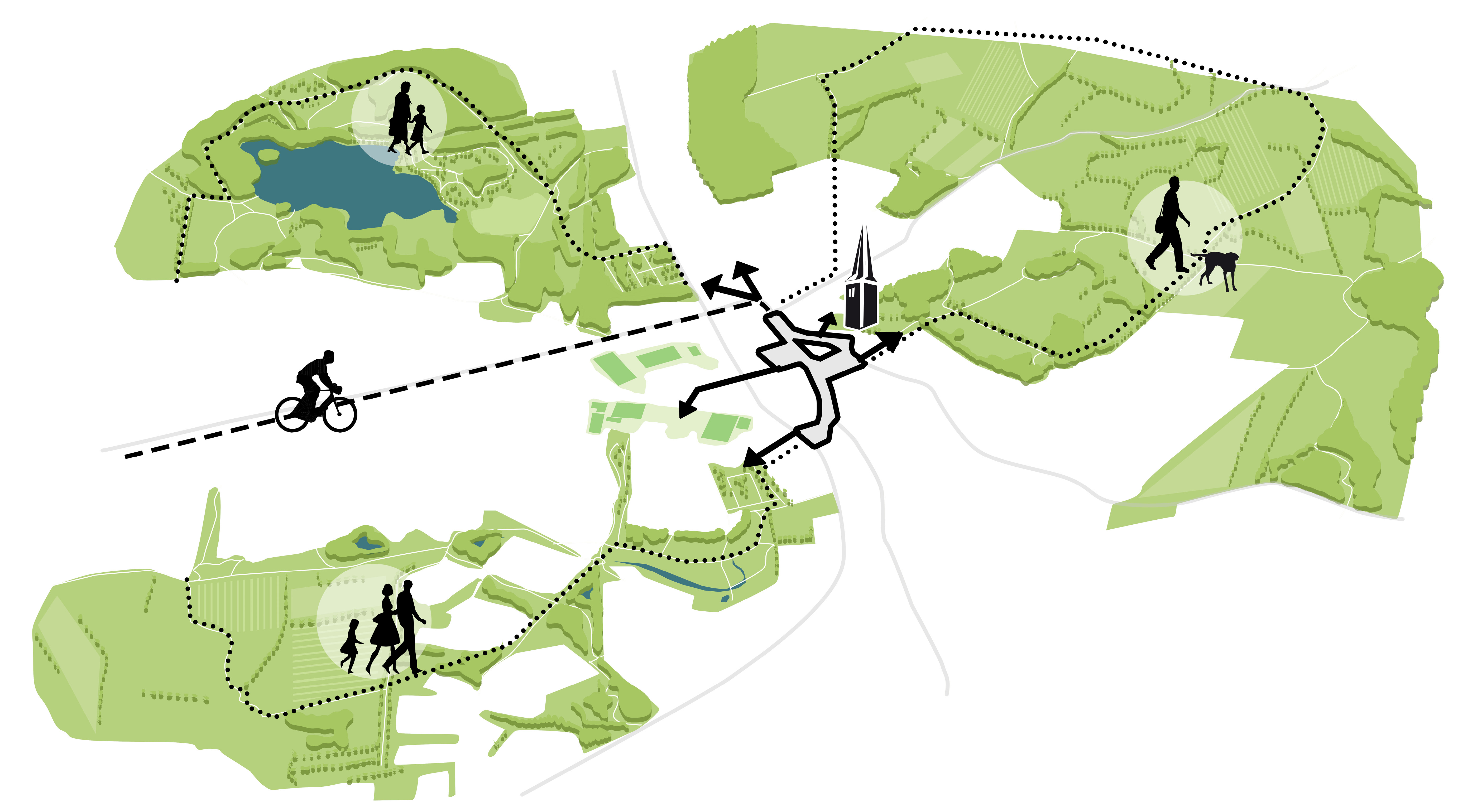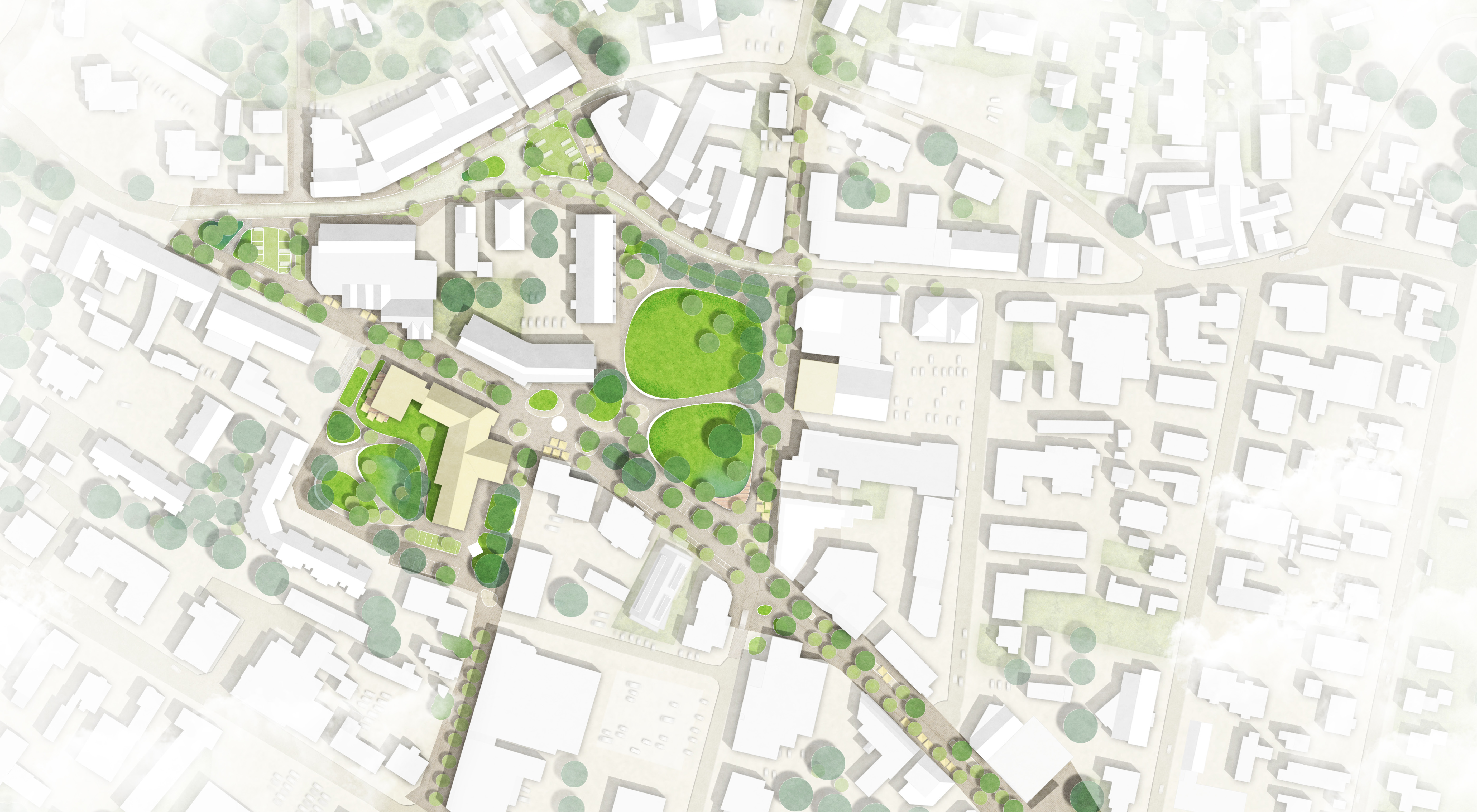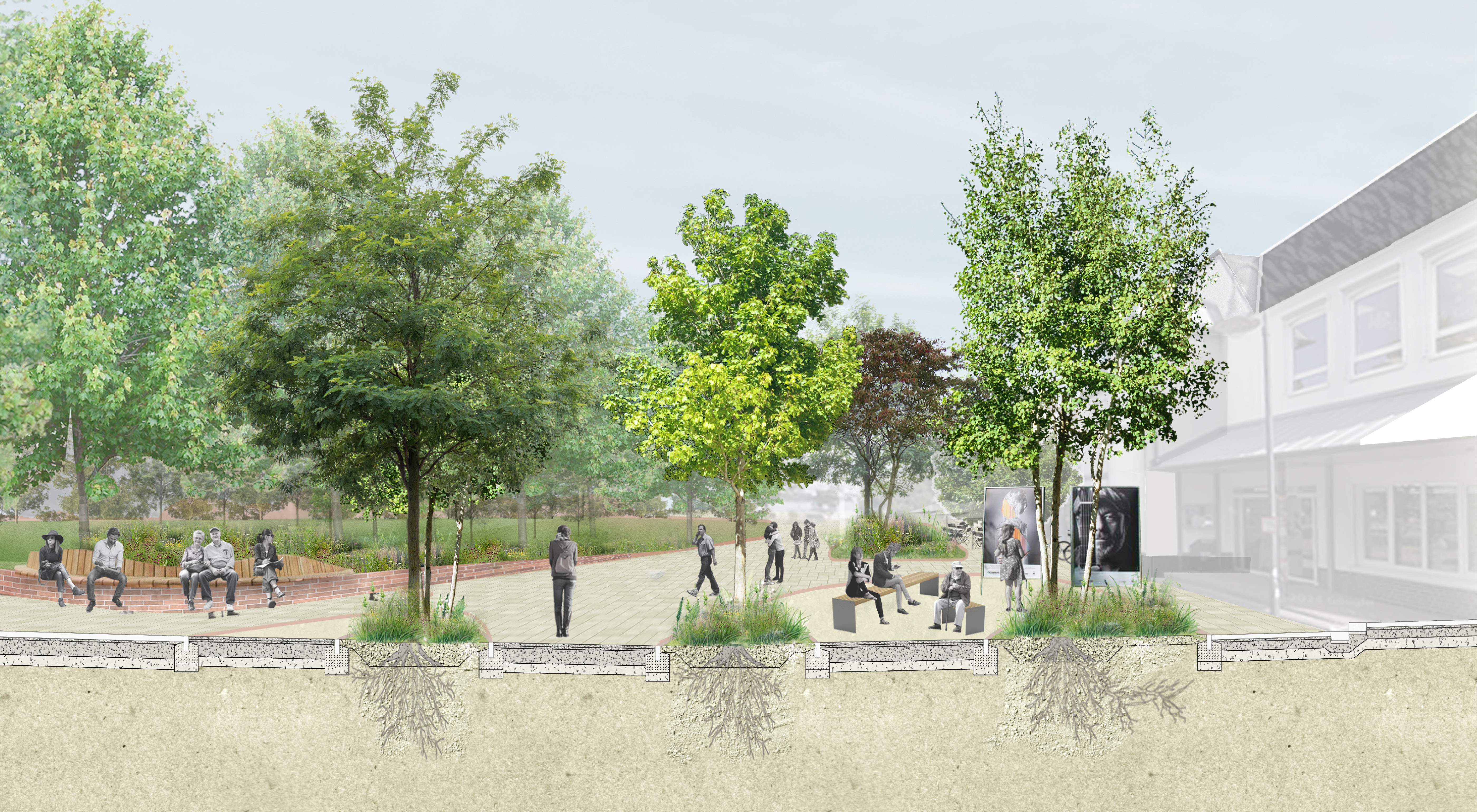 Für die Innenstadt Kaltenkirchen wurde ein Freiraumkonzept entwickelt, das neue Verbindungen im Stadtraum schafft und zentrale öffentliche Räume funktional wie gestalterisch zusammenführt. Grüner Markt, Rathausgarten und Zentralplatz werden über ein gemeinsames Freiraumband verknüpft und bilden ein einheitliches, klimaresilientes Stadtsystem. Wiesenflächen, Wetland-Bereiche, Tiefbeete und Retentionsräume übernehmen zentrale Aufgaben der Regenwasserbewirtschaftung und stärken die Biodiversität.