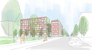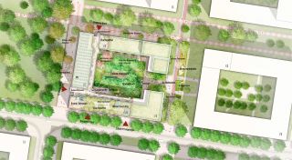 Der Innenhof beherbergt eine Event-Terrasse in einem kleinen Baumhain, perfekt zum Verweilen und für gemeinsame Momente. Grillstellen und Outdoor-Küchen laden zum geselligen Beisammensein ein. Der Nadelbaum im Zentrum schafft mit Stauden, Gräsern und einem Wasserbecken ein angenehmes Mikroklima. Obstbäume im Westen begleiten polygonale Holzmöbel, perfekt für Entspannung im Freien. Ein Naturspielplatz und Hängematten in der grünen Gasse bieten den Jüngsten ein Paradies.Zwischen Aktivband und Gehweg verbindet ein Fahrradweg das Quartier von Norden nach Süden. Der Boulevard bietet Raum für Gewerbe und Gastronomie mit Außensitzplätzen. Bäume, mobile Hochbeete, und Beleuchtung schaffen eine einladende Atmosphäre. Dächer integrieren sich mit Urban Farming, einem Naturspielplatz und großzügigen Terrassen für Bewohner:innen. Nordwestlich wird das Dach mit einer extensiven Dachbegrünung und PV-Anlagen versehen.