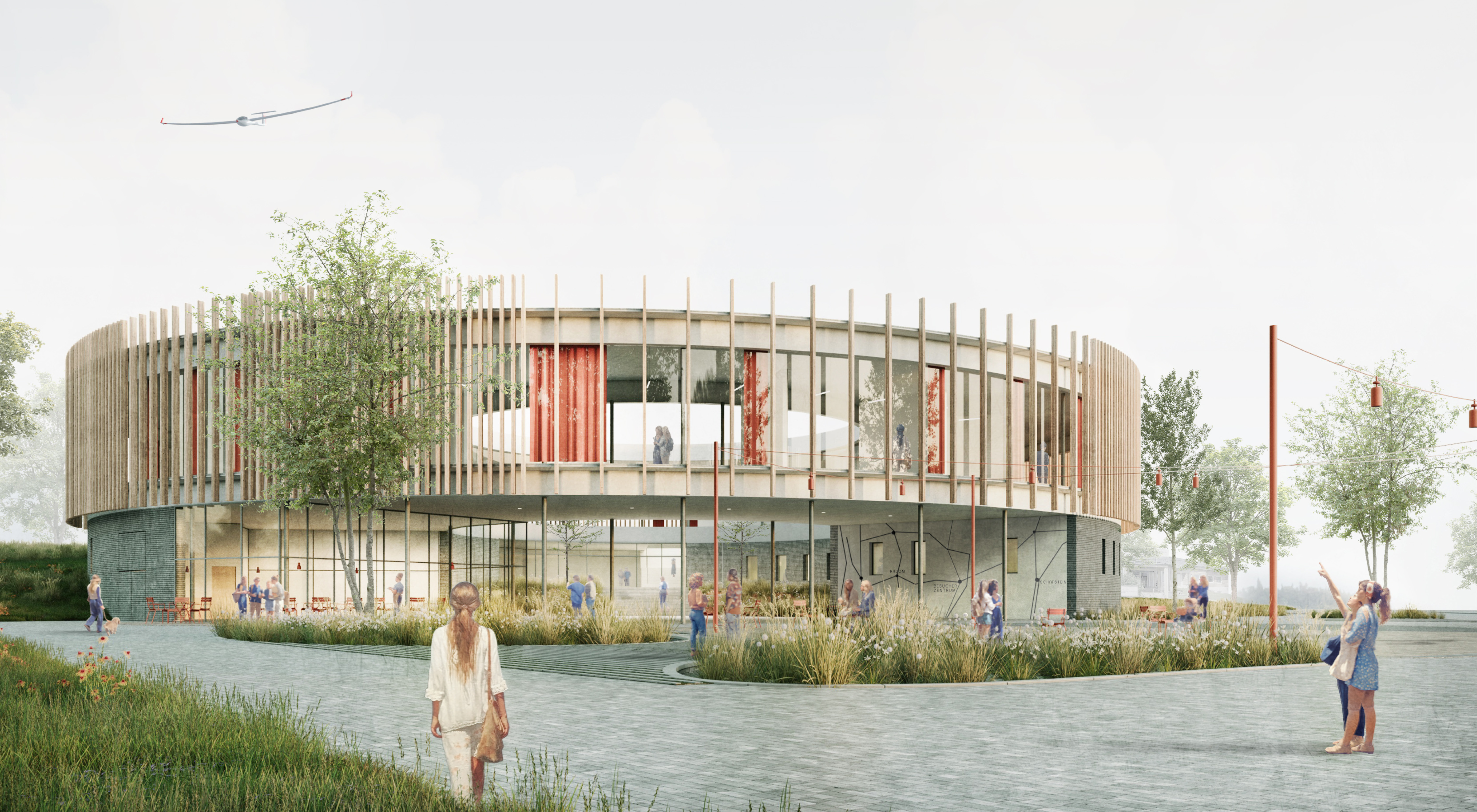 Zentrales Element ist ein lebendiger, multifunktionaler Marktplatz, der das neue Empfangsgebäude mit dem bestehenden Informationszentrum verknüpft. Naturnahe Pflanzflächen mit heimischen Gräsern und Stauden schaffen atmosphärische Räume und fördern Biodiversität.